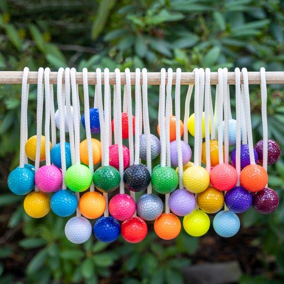 💥In order to play the outdoor game that is sometimes referred to as ‘Redneck Golf’ you will need a total of 6 golf ball bolas (3 per team). This listing is for replacement bolas for both TEAMS (6 Bolas). When adding the item to your cart, please choose which color golf ball you would like. Per the official rules of the game, the balls will be 13(+- small amounts being the rope compresses differently each time I thread it into a ball) inches apart and secured at each end of the bola. All the colors available are listed in the drop down menus – Check out the newest additions to include Gold and Silver – Perfect wedding colors!